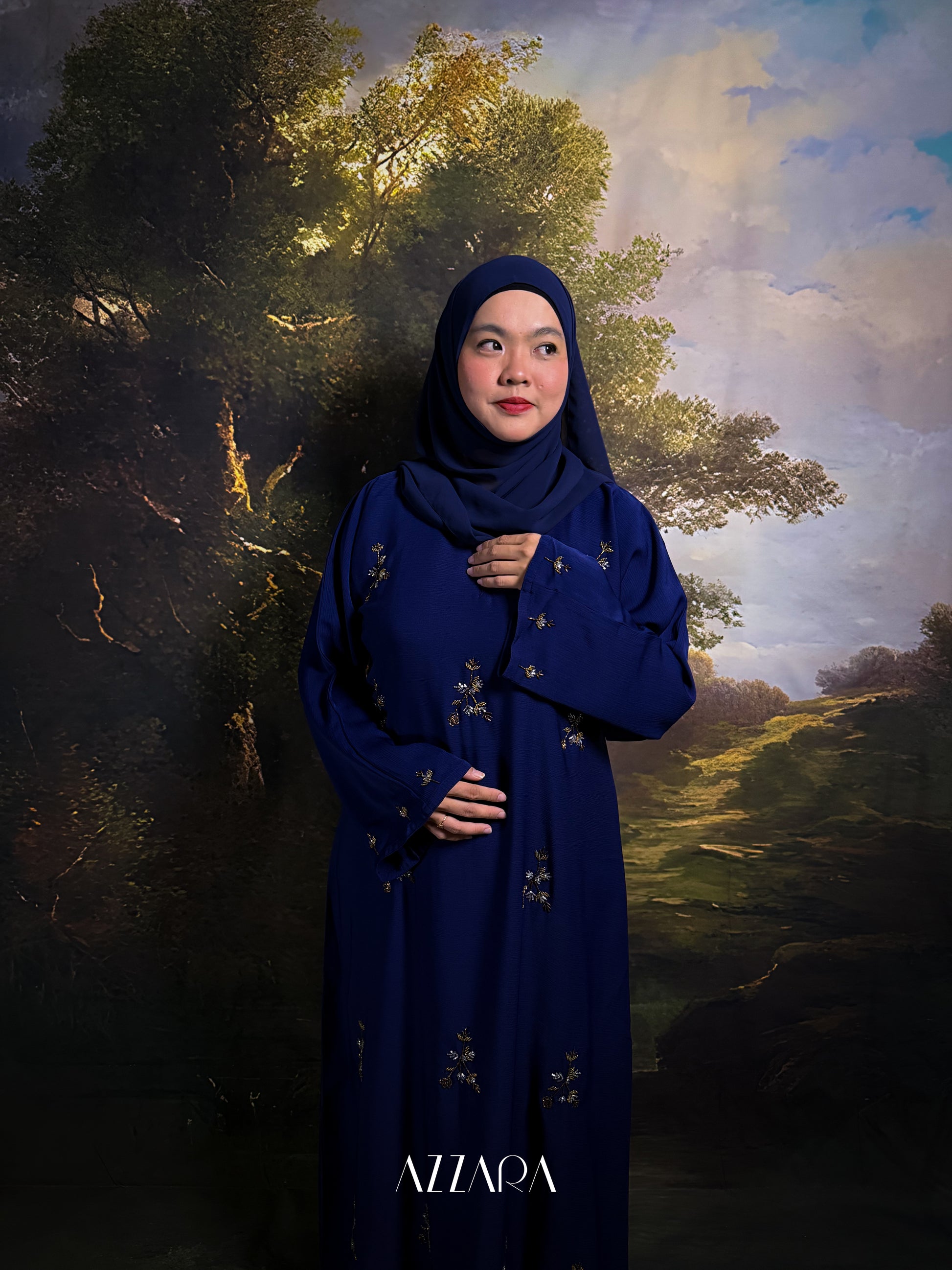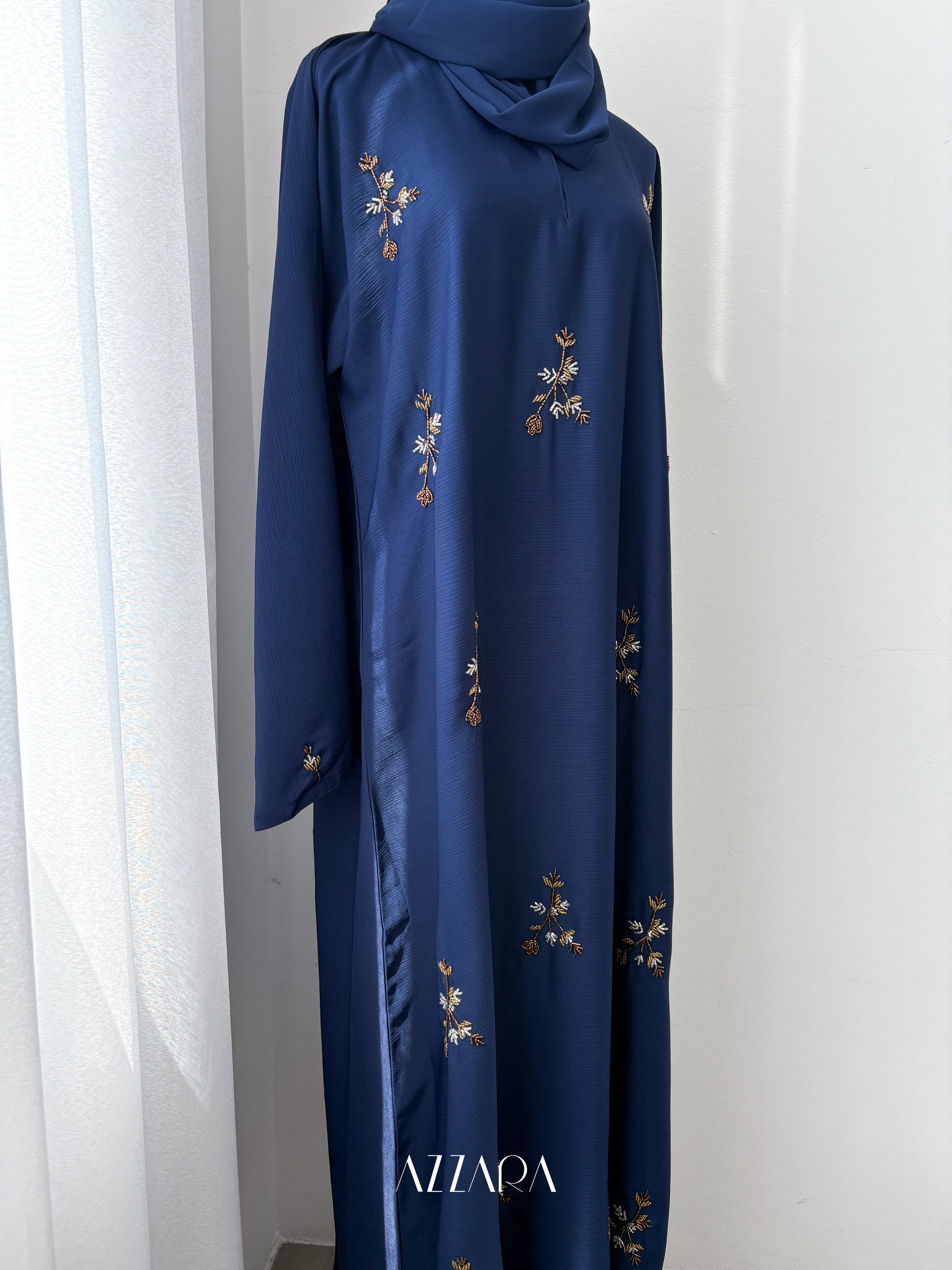 (N022) Zahraat - Golden Flower Patches abaya in Navy Blue