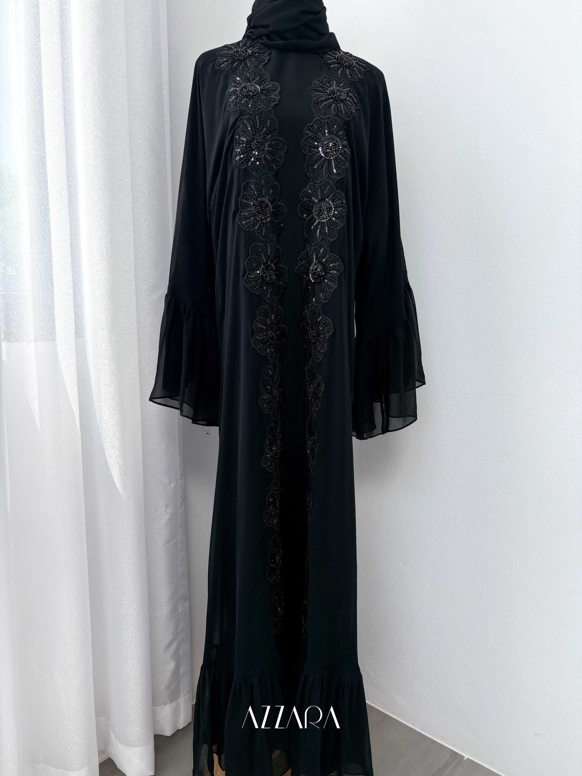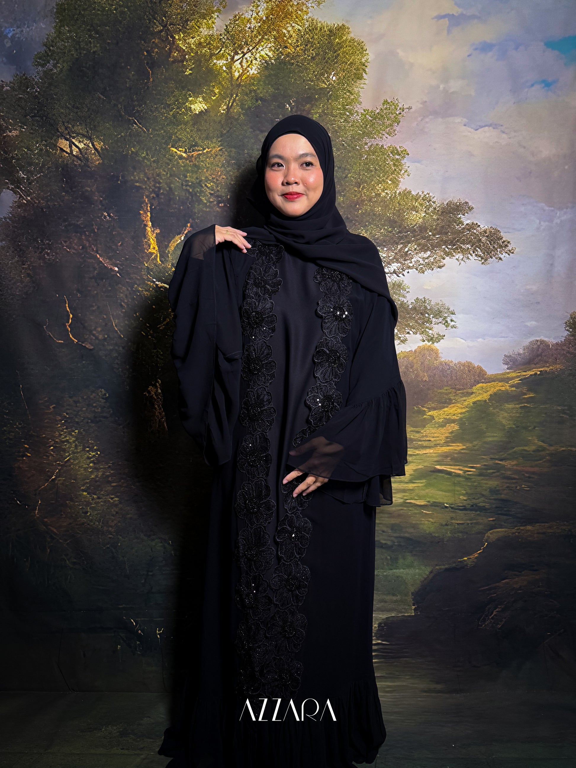 A full lace double abaya, with intricate turkish lacework from top to bottom. Versatile for all occasions—especially ideal for penggilan and dinner events.